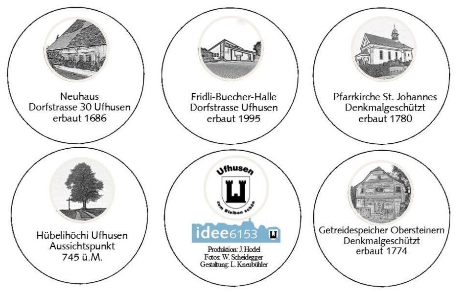 Ufhuserli, Einkaufstasche, Autokleber: Mit den „Ufhuserli“ haben wir nicht etwas neu erfunden, sondern älteres wieder neu „inszeniert“. Die Einkaufstasche kann als Geschenktasche verwendet werden und den Autokleber haben wir spontan entworfen, als bekannt wurde, dass Ufhusen die sonnigste Gemeinde im Kanton ist. Diese Artikel sind im Dorfladen erhältlich.